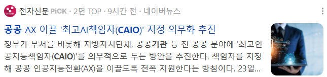 CDO에서 CAIO로의 전환은 공공 부문 디지털 전환의 본격적인 출발점이다. 단순한 데이터 활용을 넘어, AI를 통해 조직의 운영, 서비스, 정책 수립까지 혁신하는 'AI 책임자 시대'가 본격적으로 열린 것이다.