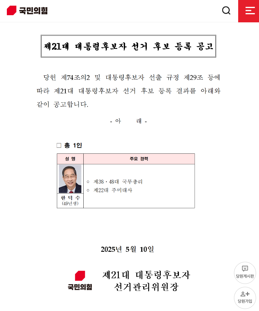 결국 협상이 무산되자 국민의힘은 5월 10일 0시 의원총회를 소집했고, 비상대책위원회(비대위)에 후보 재선출 권한을 위임하는 결정을 내렸다. 불과 몇 시간 뒤, 비대위는 김문수의 후보 자격을 박탈하고 한덕수를 대선 후보로 선출·등록했다. 한덕수는 같은 날 새벽 국민의힘에 입당, 책임당원 등록을 마쳤다.