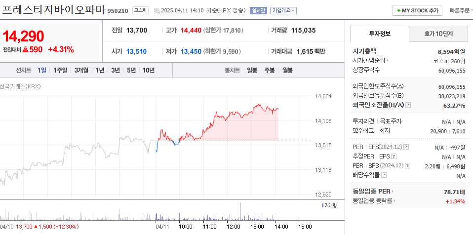 프레스티지바이오파마는 바이오의약품 개발 전문 기업으로, 항체 기반 바이오시밀러 등을 주력으로 한다. 정치와 직접적인 관련이 없음에도 불구하고, 경영진 또는 대주주 측의 학연 및 법조계 인맥 루머로 인해 한동훈 후보의 정치 행보와 연계된 테마주로 편입되었다. 이와 같은 테마주는 루머에 의해 주가가 급등락하는 경향이 있어 주의가 필요하다.