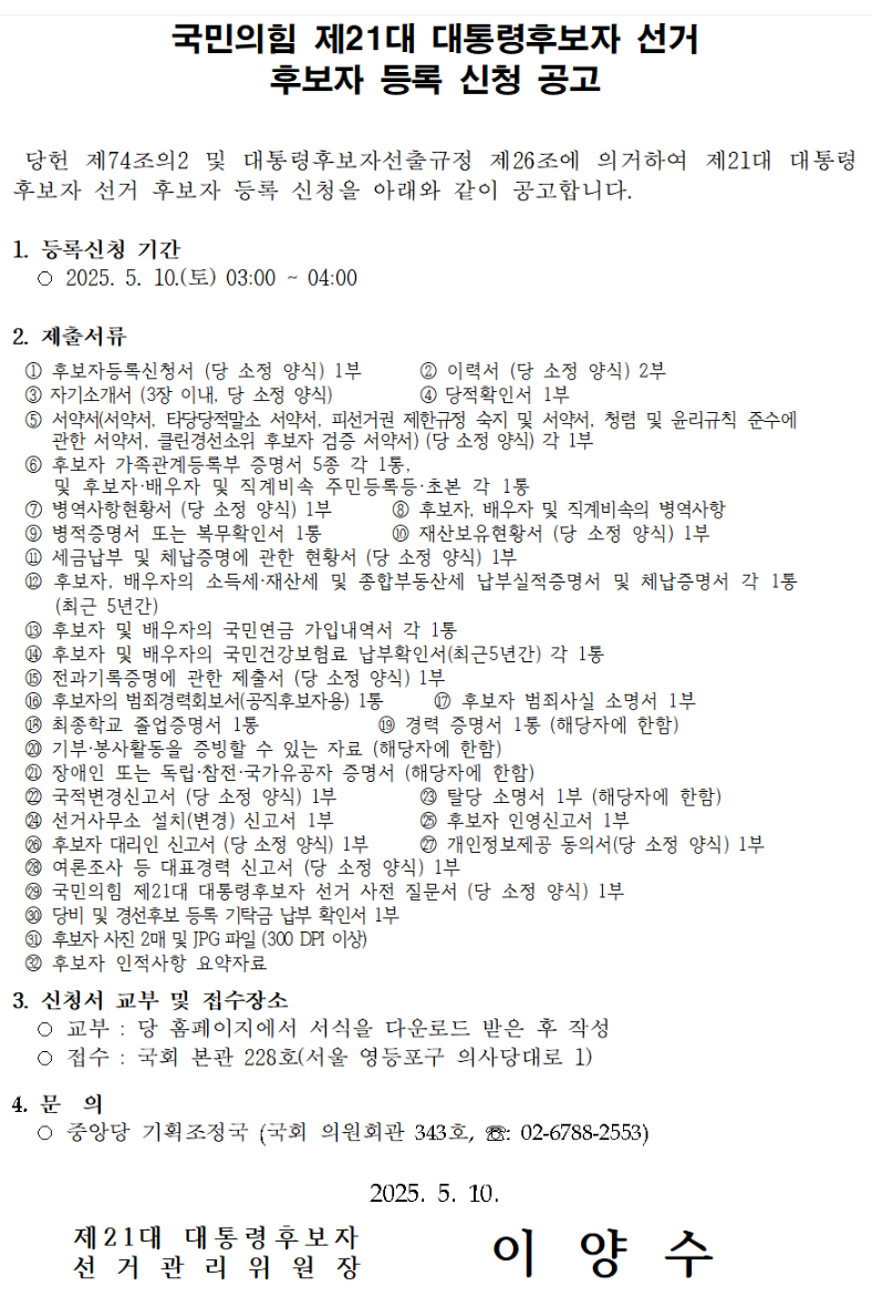 국민의힘은 2025년 5월 10일 오전 3시부터 4시까지 단 한 시간 동안 대통령후보자 등록 신청을 받는다고 공지했다. 이 공고는 중앙당 선거관리위원회 명의로 공식 발표되었으며, 등록 신청 장소는 국회 본관 228호로 지정되었다. 신청자는 당 홈페이지에서 서식을 다운로드한 뒤 정해진 시간에 맞춰 접수해야 했다.